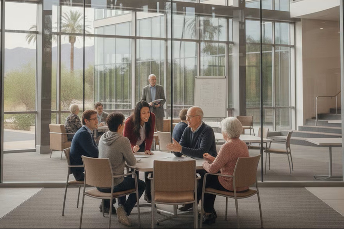 Um exemplo desses modelos é o Mirabella, a residência universitária para idosos na Arizona State University. Lá, aposentados convivem com estudantes num edifício de vinte andares dentro do campus. Os residentes têm aulas, orientam jovens e colaboram como assistentes de ensino. Professores universitários dão palestras na residência e vários estudantes de doutorado em música moram gratuitamente em troca de dar aulas e oferecer concertos semanais. Essa convivência gera um fluxo bidirecional de conhecimento. “Pudemos contribuir com uma riqueza de informações ainda maior do que a do corpo docente”, relatou à Time Caleb Bailey, estudante de guitarra que dividiu a sala de aula com duas enfermeiras aposentadas.