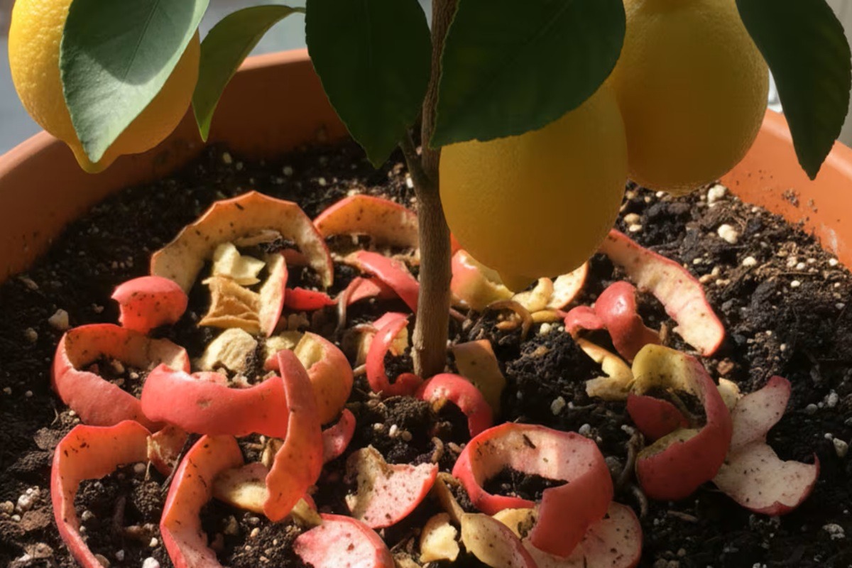 Embora geralmente acabe no lixo, a casca de maçã fornece nutrientes essenciais para o limoeiro. É rica em potássio, essencial para estimular a floração e o desenvolvimento correto dos limões, e também contém fósforo, que fortalece o sistema radicular. Além disso, adiciona fibras e matéria orgânica, o que melhora a estrutura do solo, aumenta a sua fertilidade e favorece um crescimento mais equilibrado da árvore. Este aporte natural ajuda o limoeiro a crescer mais saudável, com folhas mais verdes e novos rebentos mais vigorosos, sem necessidade de recorrer a fertilizantes químicos.