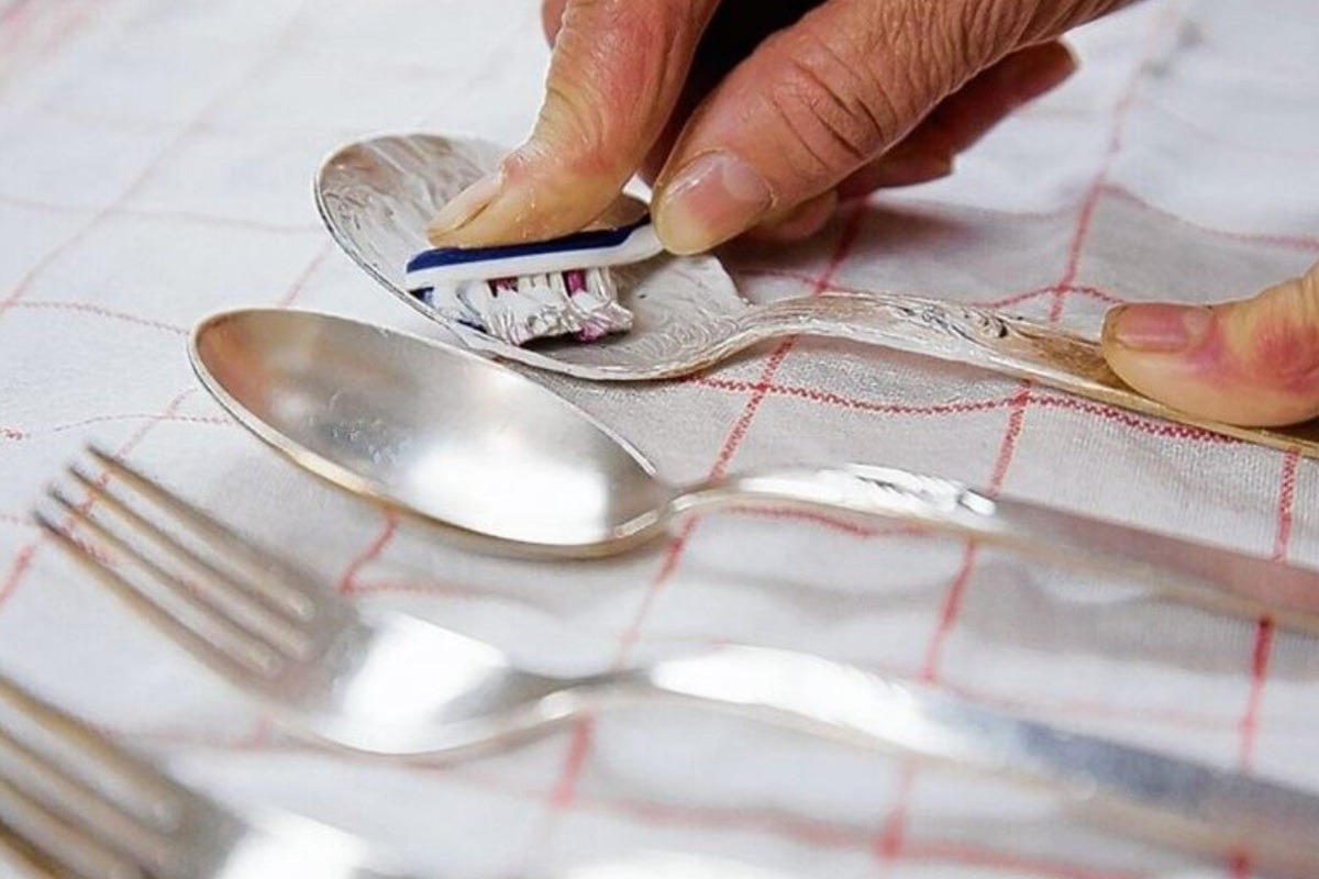 A pasta de dentes é ideal para limpar e polir objetos de prata, mas deve ser feita com muito cuidado. Basta aplicar a pasta no escova de dentes e esfregar cada objeto do talher com movimentos circulares. Em seguida, enxágue-os com água morna em abundância e seque-os com um pano limpo.