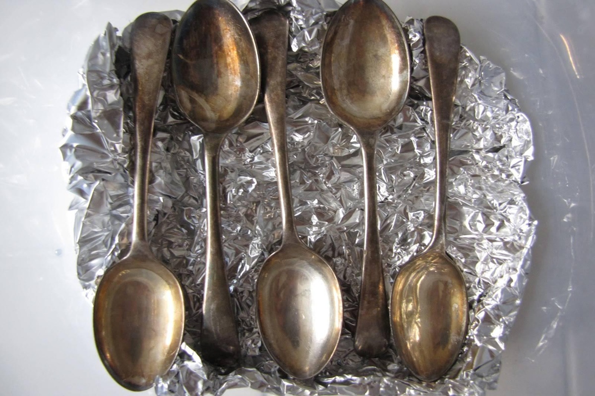 Cubra o fundo da tigela com papel alumínio e adicione 2 colheres de sopa de sal e bicarbonato de sódio. Em seguida, adicione uma quantidade suficiente de água quente e mergulhe os talheres nela por 15 minutos. Passado esse tempo, retire os talheres e seque-os com um pano limpo, e verá como eles ficam brilhantes.