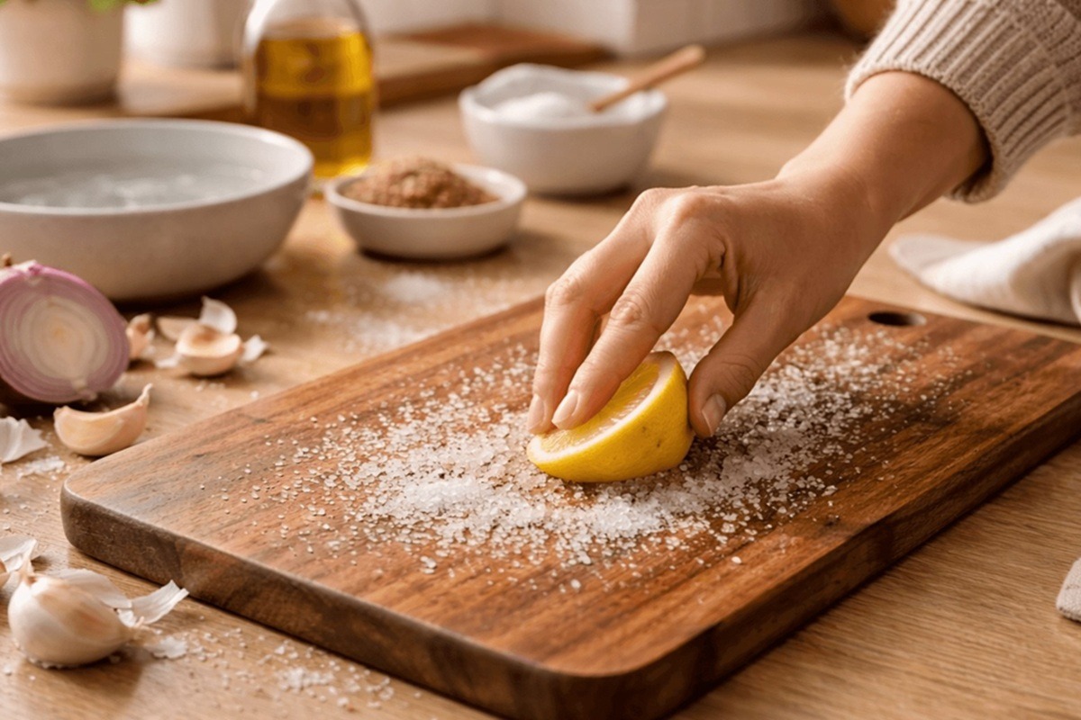 Há cheiros que permanecem mais tempo do que deveriam na sua tábua de madeira. O cheiro de alho e cebola é um deles. Pode lavá-la imediatamente, usar sabão, enxaguar com cuidado. e mesmo assim, o aroma continua lá, misturando-se com o que cortar depois. A explicação é simples. A madeira é porosa e os cortes da faca criam microcanais onde essas substâncias ficam presas, por isso uma limpeza eficaz não consiste em deixar a tábua de molho, mas sim em reduzir ao mínimo o contacto com a água e garantir uma secagem completa.