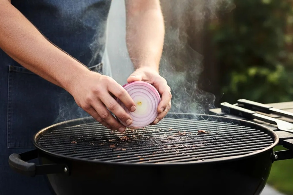 Recomenda-se esfregar cebola na grelha quente porque os seus sucos naturais limpam, desengorduram e desinfetam a superfície graças aos seus compostos sulfurosos e açúcares. Mais precisamente, esta parte da cebola cria uma camada antiaderente que é capaz de remover resíduos e bactérias e, como se não bastasse, também pode dar um sabor à carne do churrasco. Para obter estes e muitos outros benefícios, basta aquecer a grelha a uma boa temperatura e cortar uma cebola ao meio. Em seguida, segure metade da grelha com uma pinça e esfregue a cebola vigorosamente sobre os ferros quentes, raspando a sujidade. Depois, deite fora a cebola usada e limpe os restos com um pano ou papel alumínio.