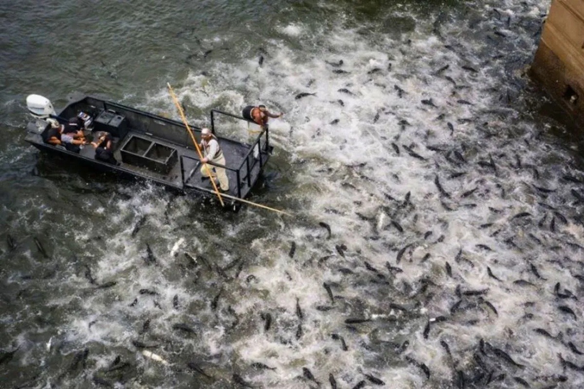 A carpa asiática foi introduzida nos Estados Unidos no século XX para combater as algas e melhorar a qualidade da água em lagoas agrícolas, mas fugiu para os rios ligados ao Mississippi. Desde então, ela se espalhou rapidamente pelo sistema fluvial e se tornou uma séria ameaça às espécies de peixes locais, pois compete com elas por alimento e espaço, o que pode levar à substituição de espécies tradicionais e à alteração da cadeia alimentar.