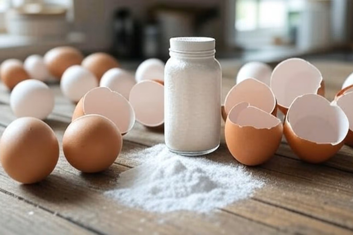 Cascas de ovo, bicarbonato e um produto de limpeza caseiro