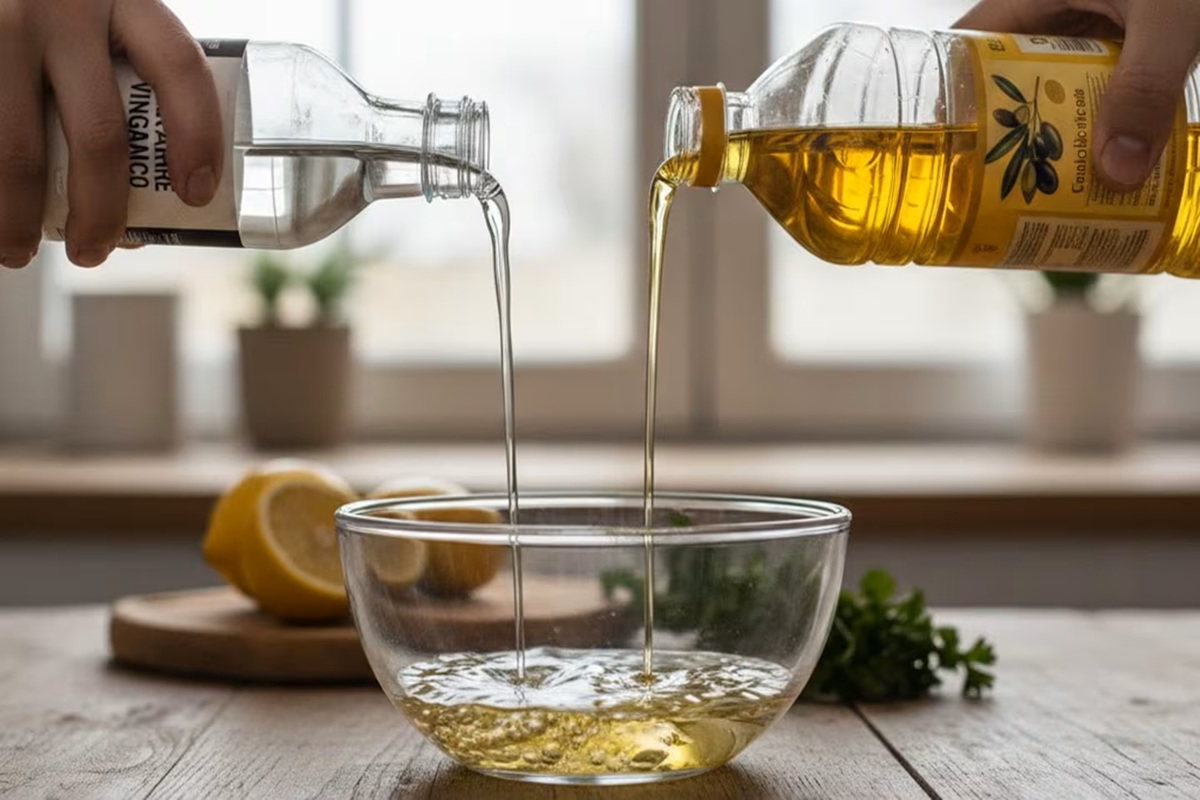 - Prepare a mistura: num recipiente, misture partes iguais de vinagre branco e óleo (pode ser de oliva ou de girassol).