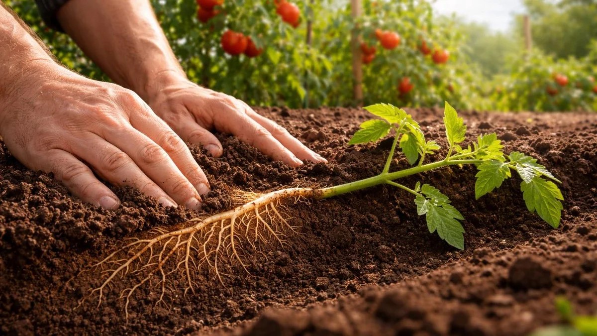 Os cultivadores experientes abordam os tomates com uma prioridade: garantir-lhes uma base o mais firme possível debaixo da terra. Não se trata apenas de que a muda «se mantenha» no canteiro, mas de que desenvolva um sistema radicular o mais extenso e forte possível. Desta perspetiva, plantar «deitado» é uma escolha absolutamente lógica.